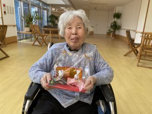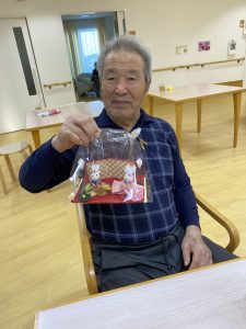 特養ユニットにて、カラオケレクに参加して頂いた方に、手作り雛人形をプレゼントさせて頂きました。